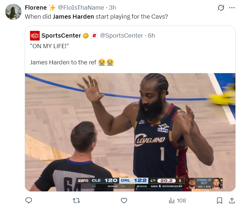 在终场前20.2秒,哈登与班凯罗争夺一个球权,裁判判魔术球权,哈登说我们的球,我们没有碰,我用我的生命发誓,我用我的生命发誓,只可惜骑士没有挑战权了,裁判还是给了魔术球权,随后贝恩就命中了一个恐怖的漂移三分球,骑士功亏一篑。